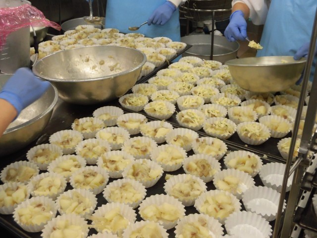 今日の給食は、チキンライスです。給食では、大きなお釜14個分の量を作るので、お米をトマトジュースで炊き、炒めて味をつけた具材と混ぜ合わせて作っています。