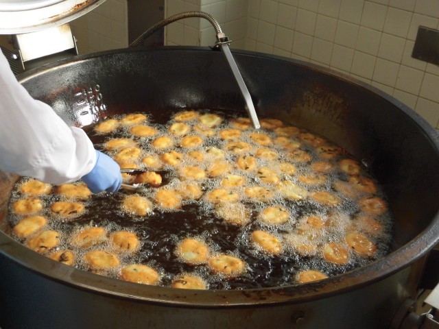今日の主菜は、手作りさつま揚げです。給食では、たらのすり身に豆腐と野菜を混ぜ合わせ、油で揚げて作っています。コーンや玉ねぎが入っているので、野菜の甘味があり、子供たちにも食べやすい味付けです。ご飯は、有機米を使っています。