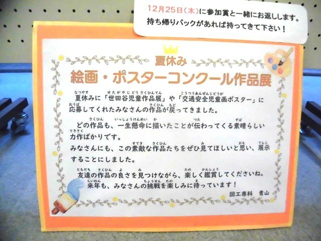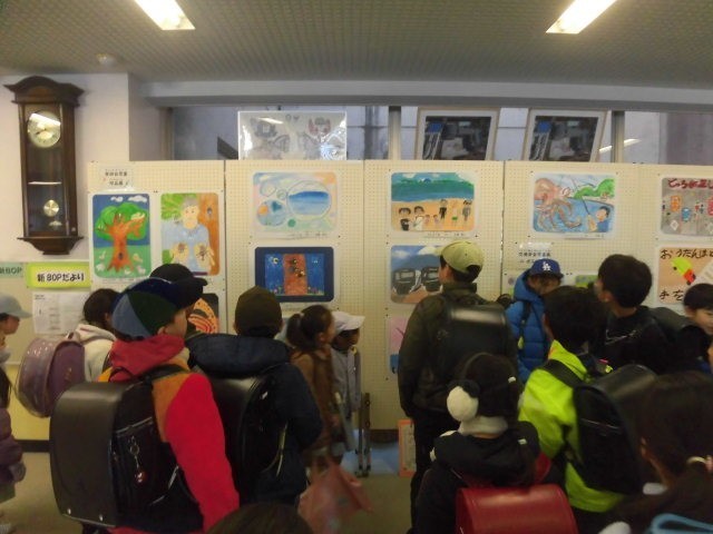 昇降口を上がったところに人混みができています。夏休みに取り組み、休み明けに応募した作品が展示されているのです。子どもたちは友達の作品を見つけてうれしい歓声をあげたり、お気に入りの作品を見つけて足を止めてじいっと鑑賞したりしていました。2学期の終わりに作品を返す時期となりましたが、図工の先生より、展示してみんなに見てもらいたいという申し出があって、実現したこの作品展示コーナーです。力作ぞろいで、じっくり見ていたくなる作品ばかりでした。