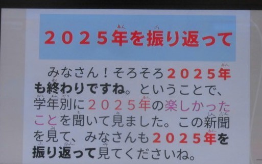 昇降口には新聞委員会の作ったデジタルサイネージによる新聞があります。写真のような記事で、委員会の子どもたちが1年を振り返り、冬休みに向かう気持ちを高めてくれます。