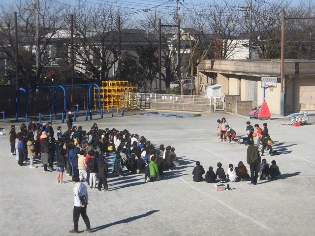 新年あけましておめでとうございます。今日から3学期が始まりました。朝の冷え込みは厳しく、霜が降りたところもあったようです。学校からは富士山がくっきりと見えました。寒い中でも、3年生が学年全体で楽しい催しを行っていました。