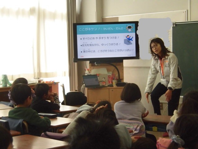 2年生の教室では、家の中の安全についてゲストティチャーの先生が授業をしています。子どもたちは、話をよく聞いて、発言もしています。そのなかでは、いろいろな事故に遭わないようにと、「ふたんから家の中を片付けておく」「少し先のことを考えて行動する」「危ないときは、大声で近くの大人を呼ぶ」ということを学びました。そして自分の身を自分で守るということが分かったようです。