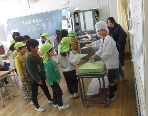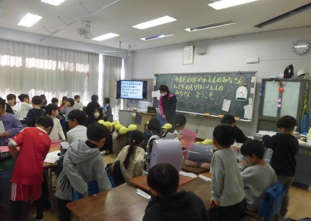 1年生が近くの保育園の子どもたちと交流会を行っています。園児たちは、ランドセルを背負う体験や給食の配膳を行う体験などを、1年生の子どもたちのリードによって行いました。複数の保育園と1年生の各クラスが数日間にわたって行う「保育園交流会」です。それぞれのクラスで特色のある交流を行います。交流の最後には「みなさんが入学してくるのを待っています。入学した後も、わからないことがあったら私たちに聞いてください」と代表児童が終わりのあいさつをして、終了となりました。1年生も園児も少し緊張していましたが、いい交流会になっていたと思います。