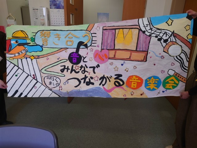 来週からは2月ですね。梅の花が香っているのを感じ、春が近づいているなと思っています。今、2月に行われる音楽会を前に、演奏だけでなく、いろいろね準備がすすめられています。こんなすてきなお知らせが、できあがりました。よく見ると、立体的なところもあって凝った作りになっています。楽しみですね。
