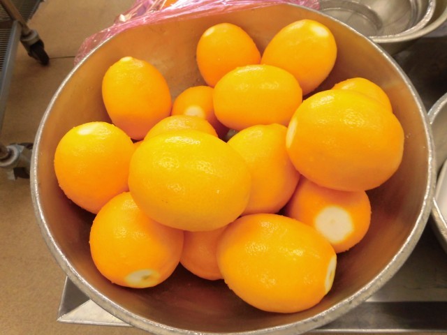 今日のデザートは、八丈島産レモン入りチーズケーキです。東京の八丈島で生産されている「フルーツレモン」という品種のレモンを使っています。ほかのレモンと比べて、実が大きく、酸っぱくないのが特徴です。