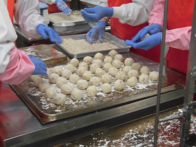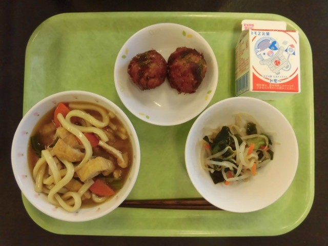 今日の給食は、ポテトたこ揚げです。たこ焼きを給食向けにアレンジした料理です。生地は小麦粉ではなく、じゃがいもを使って作りました。中にたこやねぎを混ぜ、油で揚げました。ソースと青のりをかけると、見た目はたこ焼きのようです。
