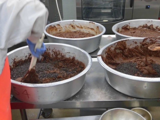 今日のデザートは、チョコケーキです。リクエスト給食のデザート部門で2位に選ばれました。ケーキの生地にココアとチョコチップを混ぜ合わせ、オーブンで焼き上げました。