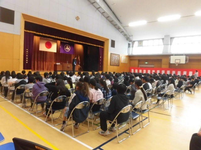 5時間目、体育館で5,6年合同の卒業式練習を行いました。式の流れをつかみ、動きを把握させるように指導しています。そのなかには「門出の言葉」の練習や、卒業式歌の練習もあります。体育館には350名以上の子どもたちがまとまって、練習しています。