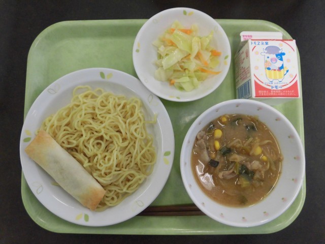 今日の給食は、大人気のみそラーメンです。みそラーメンは、リクエスト給食の主食・おかず部門で1位になりました。さつまいもの春巻きは、ペースト状にしたさつまいもを春巻きの皮に包んでいます。オーブンで焼いて皮をパリッとさせました。