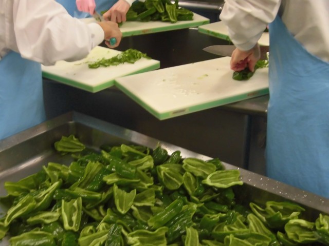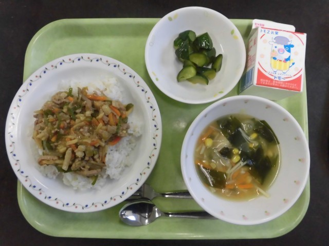 今日の主食・主菜は、チンジャオロース丼です。「チンジャオ」はピーマン、「ロース」は肉、「スー」は細切りという意味があります。春が旬のたけのこも入っています。