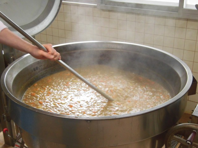今日から1年生の給食が始まります!最初の給食はカレーライスです。給食のカレーは、「回転釜」と呼ばれる大きなお鍋でじっくり煮込んで作ります。砧南小学校の調理員さんは、みんなで力を合わせて約1100人の給食を作っています。