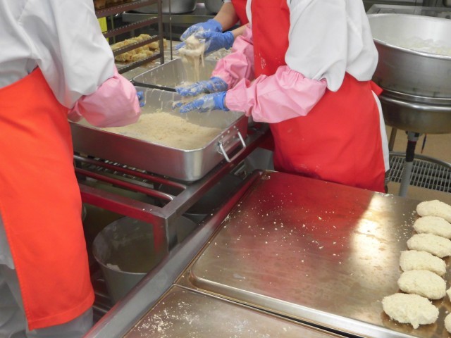 今日はセルフコーンコロッケサンドです。コロッケを自分ではさんで食べます。コロッケはコーン入りなので、甘さを感じられます。調理員さんがひとつずつ丸めて作りました。