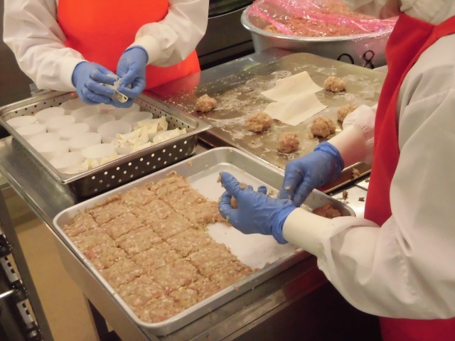今日の主菜は、ジャンボしゅうまいです。給食のしゅうまいは一人1個なので、とても大きいです。豚肉にたまねぎや調味料を入れてよく練り、しゅうまいの皮に包んでから、オーブンで蒸しています。