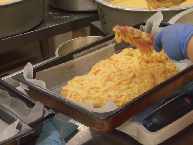 今日のデザートはキャロットケーキです。にんじんをケーキの生地に加えました。にんじんは、色々な料理に合い、見た目もおいしそうに見せてくれるので、給食では毎日使う食材です。
