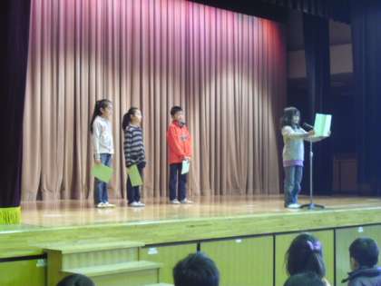 その後、4年生の代表のお友達が3学期がんばることを発表しました。みんな、とても立派に発表できました。
