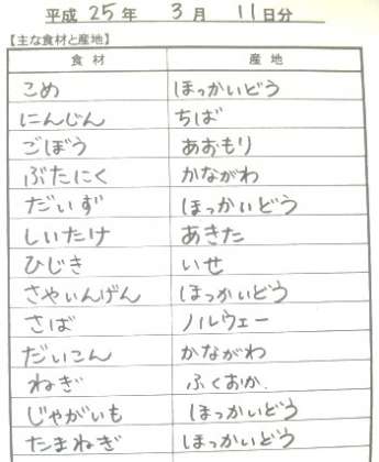 3月11日給食食材産地