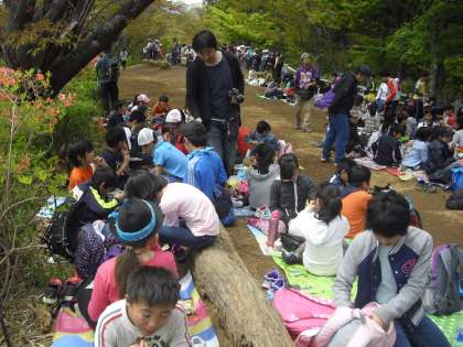 5年生は高尾山に登りました。この日は、推定20校が遠足に来ており、駐車場、頂上、ケーブルカー乗り場と、大混雑でした。