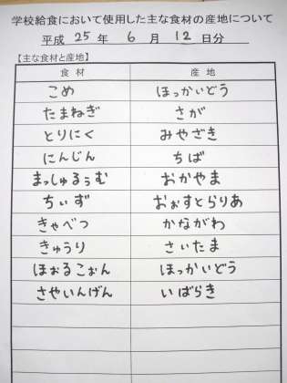 6月12日の給食食材産地