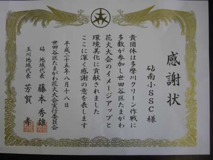 多摩川の花火大会の翌日にゴミ拾いのボランティア活動をしたサッカー部への感謝状。
