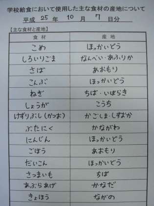 10月7日の給食食材産地