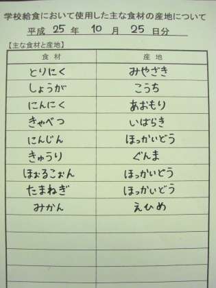 10月25日の給食食材産地