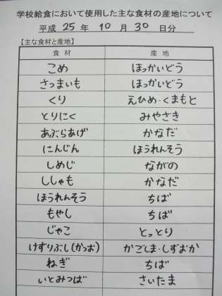 10月30日の給食食材産地
