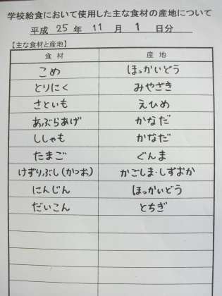 11月1日の給食の主な産地です。