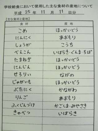 11月11日の給食食材産地