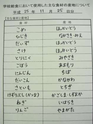 11月25日の給食食材産地