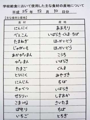12月10日の給食食材産地
