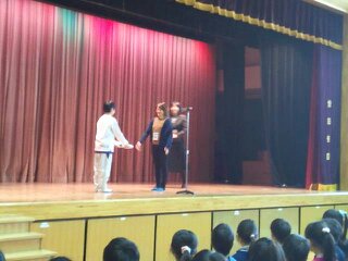 全校朝会で、PTA校外委員長の方から、児童会の代表に