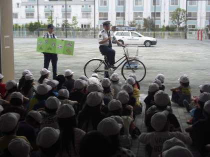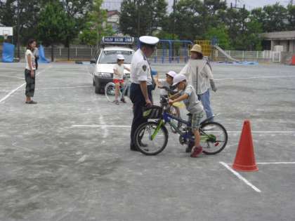 校庭では、成城警察の方々にも来ていただいて、正しい乗り方の実技指導をしていただきました。