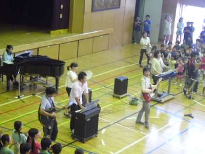 朝の音楽集会では、先生方のサプライズ演奏がありました。