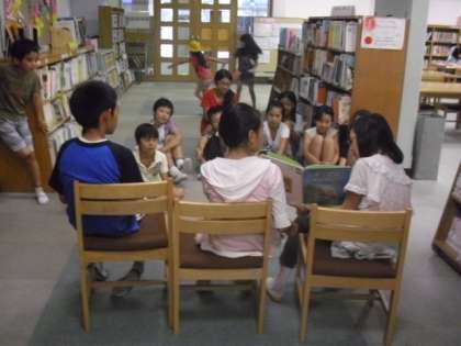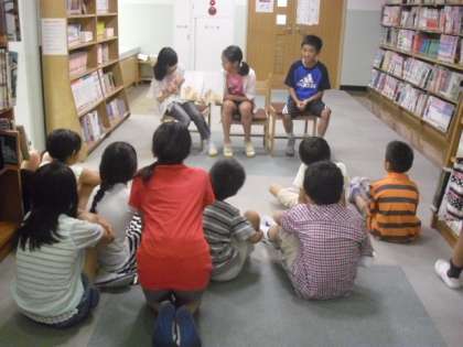 中休みに図書ラウンジをのぞくと、図書委員が読み聞かせをしていました。