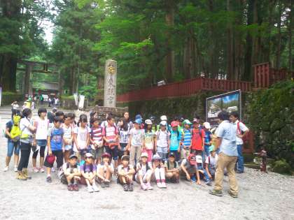 クラス写真を撮りました。後ろは東照宮の石碑です。