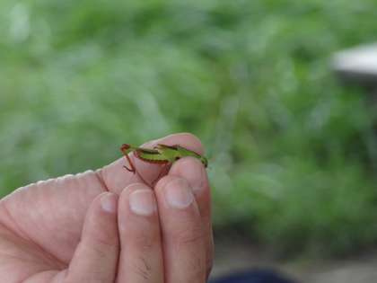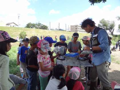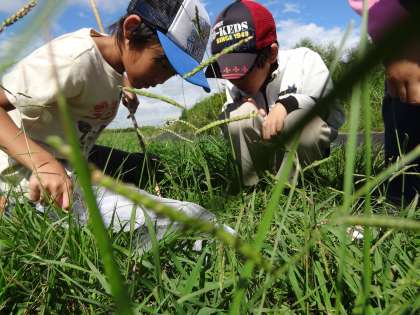 「草地ガサガサ」では、バッタやカマキリ、チョウなど草地に生息している昆虫類の捕獲と観察をしました。子供たちは、「いた。」「つかまえた!」「すごい、見せて見せて!」と生き生きと活動していました。