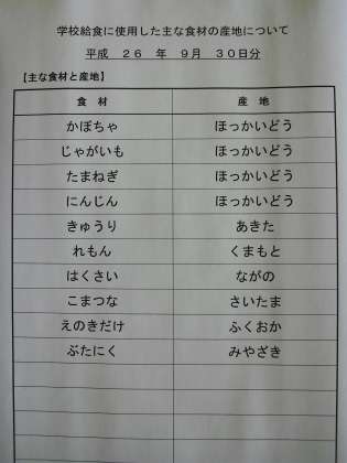 9月30日の給食食材産地