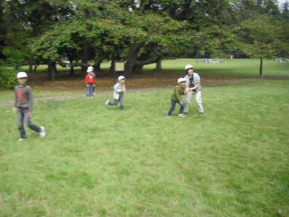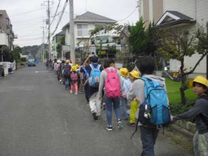 6年生と1年生、5年生と3年生、4年生と2年生というペアで手をつないで砧公園まで行きました。