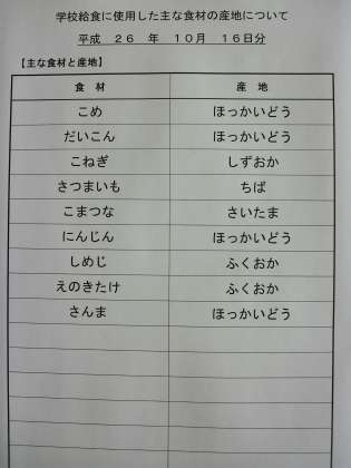 10月16日の給食食材産地