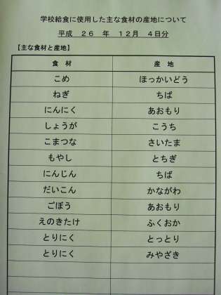 12月4日の給食食材産地