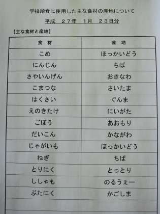 1月23日の給食食材産地