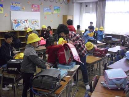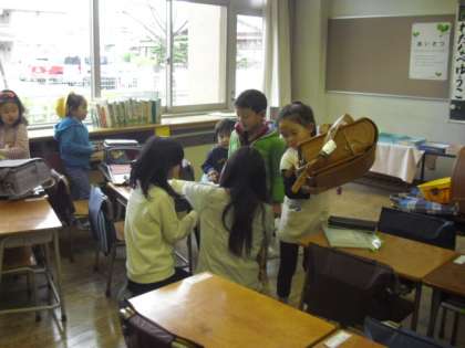1年生の教室には、毎朝、6年生のお兄さんお姉さんが待っています。お道具箱やランドセルのしまい方、机の中の整頓の仕方等を教えてくれます。