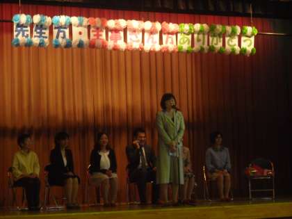 去られた先生方に、代表児童が作文を読み、花束を渡しました。