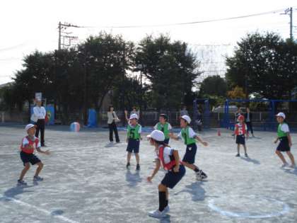 ボールをパスでつなぎ、ゴールにいる味方がキャッチすると得点が入るゲームです。練習やゲームの中で、子どもたちは、声をかけ合ってパスをしたり、パスをもらいやすい場所に走ったりする動きを頑張っていました。