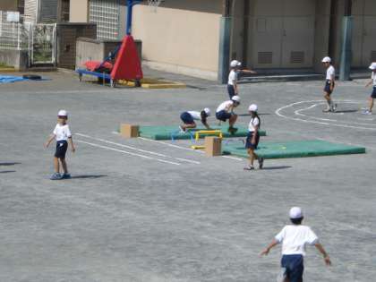 踏切で膝を上げることや、安定した着地をするための場が用意されており、子どもたちは友達と教え合って、意欲的に学習していました。