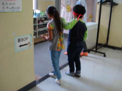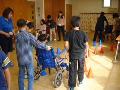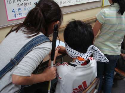 4年生は総合的な学習の時間で、福祉の勉強をしています。今日は、アイマスク体験や車いす体験をしました。目の不自由な人を案内する時の方法も学びました。