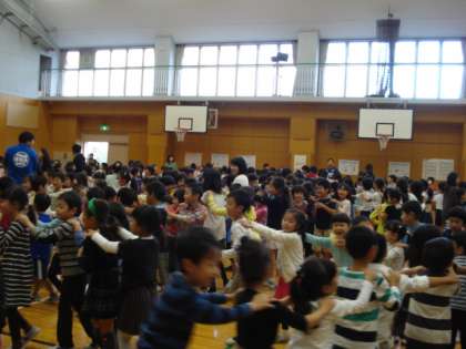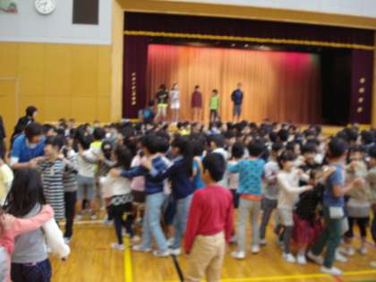 本日の朝の活動は、ジャンケン列車集会でした。男子は女子とジャンケンして、負けた人が後ろにつながります。ジャンケンを繰り返し、列車のように人が長くなっていく遊びです。男女が混じって、学級、学年をこえて楽しむことができました。