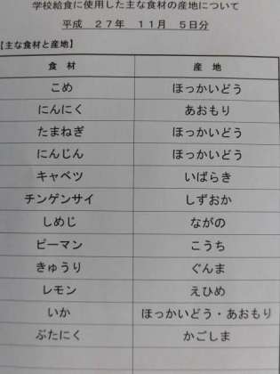 11月5日の給食食材産地