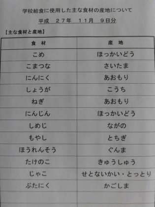 11月9日の給食食材産地
