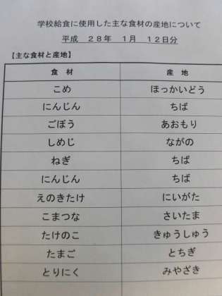 1月12日の給食食材産地